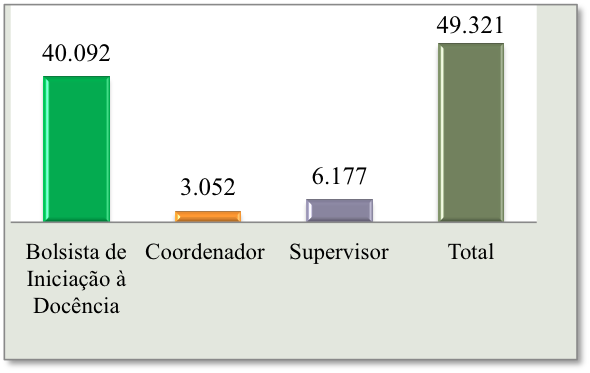 Como percebemos no Gráfico 02, o número de bolsas concedidas neste período foi destinado aos alunos de Iniciação à Docência, Coordenadores e Supervisores, sendo os bolsistas de Iniciação à Docência contemplados com 81% das bolsas, os Coordenadores com 6% e os supervisores com 12,5%, em media, somando um total de 49.321 bolsas.