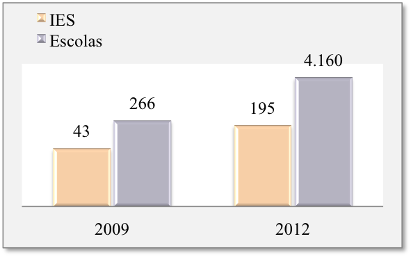 Em relação às IES atendidas pelo PIBID, de acordo com o Gráfico 03, é possível perceber, do ano de 2009 para o ano de 2012, que este programa contemplou mais 152 instituições, representando acréscimo médio de 353,5% no período. Quanto ao número de escolas públicas contempladas, mais 3.894 escolas, um acréscimo médio extremamente elevado, na ordem de 1.464%.