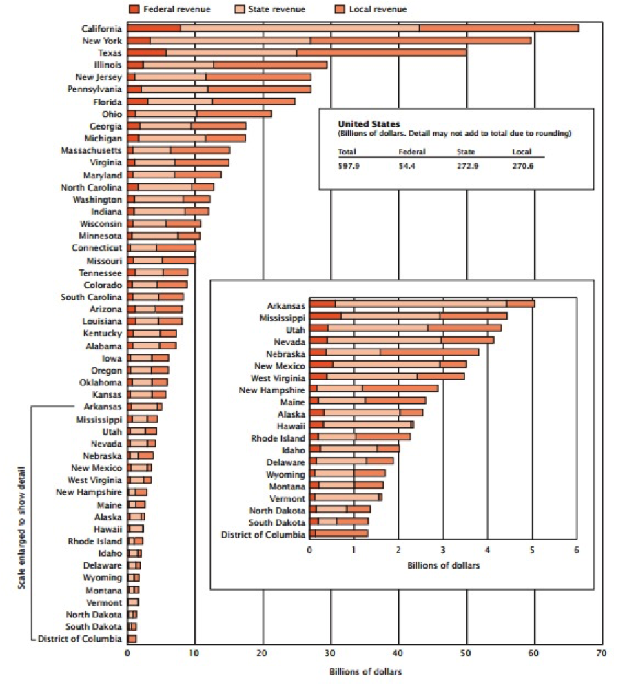 “A receita de fontes federais” inclui verbas aprovadas através de governos estaduais, bem como os gastos federais diretamente recebidos. "A receita de fontes estatais" consiste única dos montantes provenientes de governos estaduais. "A receita de fontes municipais" é constituída por receitas levantadas localmente incluindo impostos, encargos e variadas receitas.” (U.S Census Bureau, 2013 Tradução do autor)