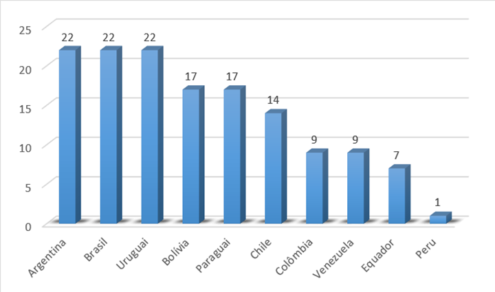 Ainda apontando sobre os locais de reunião da rede, destaca-se que o Uruguai foi o país que mais sediou reuniões, totalizando 9 (nove), seguindo o Brasil que sediou 6 (seis) reuniões, a Argentina 4 (quatro) e o Paraguai com 3 (três) reuniões.