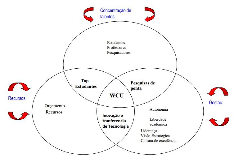 As características apontadas pelo documento como centrais das Universidades de Excelência podem ser distribuídas em três grupos: a) alta concentração de talentos (professores e alunos), b) recursos abundantes para oferecer um ambiente de aprendizagem fértil e para realizar pesquisas avançadas, e c) recursos de governança favoráveis que incentivam visão estratégica, inovação e flexibilidade, para permitir que as instituições tomem decisões e possam gerir os recursos sem serem prejudicadas pela burocracia. Este modelo pode ser visualizado na imagem a seguir: