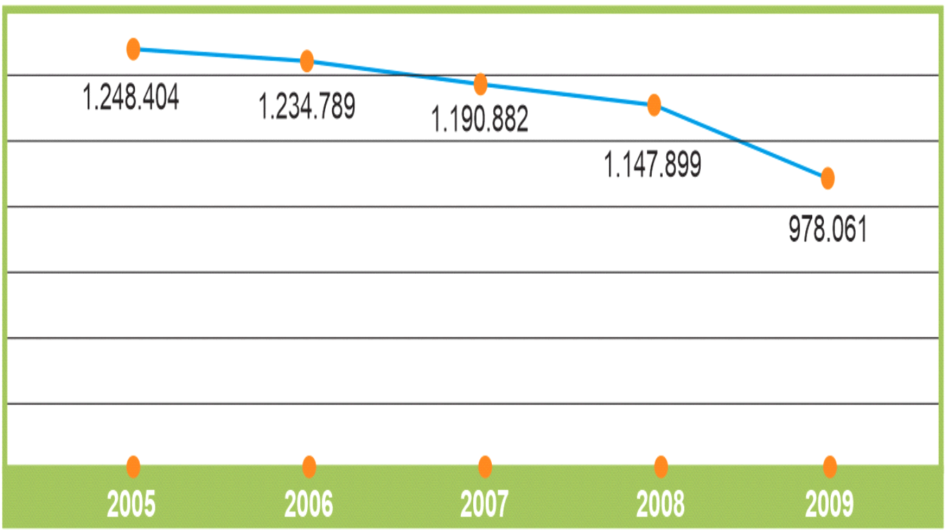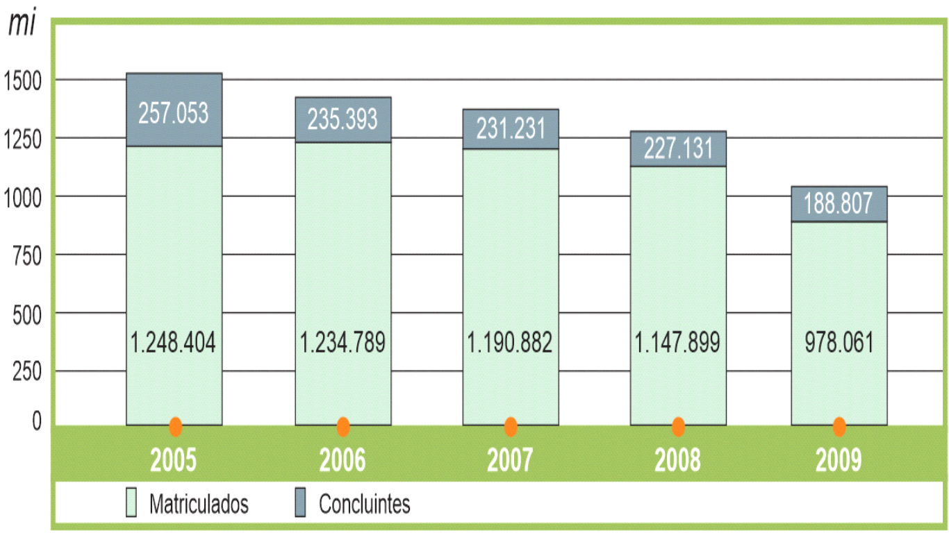 Outra realidade ressalta nesse contexto: segundo esta mesma fonte, além do número de matrícula ter diminuído nas licenciaturas, o número de concluintes nos referentes cursos também diminuiu, como mostra o Gráfico 02. De 2005 a 2009 o número de concluintes passou de 257.053 para 188.807, ou seja, há uma diferença de 68.246 alunos concluintes entre os dados destes três anos.