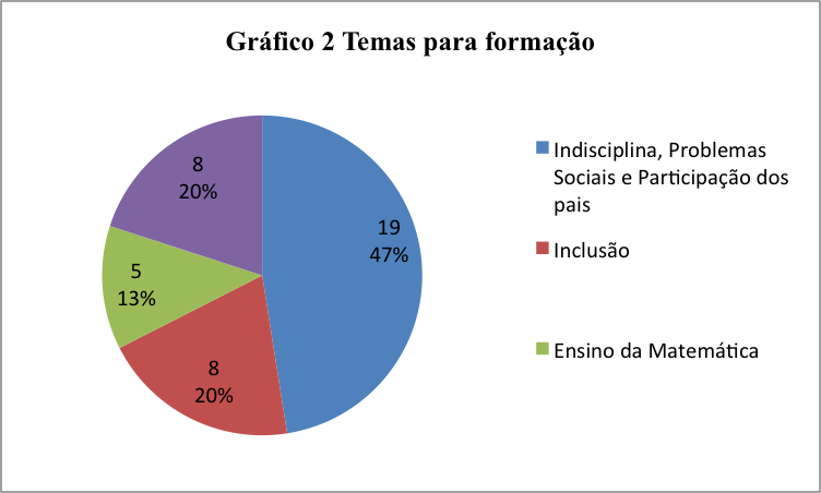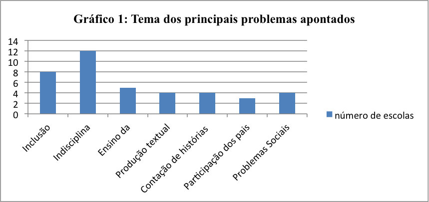 A partir dessa solicitação feita a todas as Unidades Escolares Municipais, tivemos as seguintes respostas: doze escolas colocaram que seu principal problema se refere ao conjunto de questões que revelam sua dificuldade e seu não saber em trabalhar com a indisciplina; oito unidades escolares apontaram o assunto inclusão; cinco, sobre o ensino da matemática; cinco, produção textual; cinco, contação de histórias; cinco, problemas sociais; quatro, participação dos pais. Assim, podemos ter o seguinte gráfico: