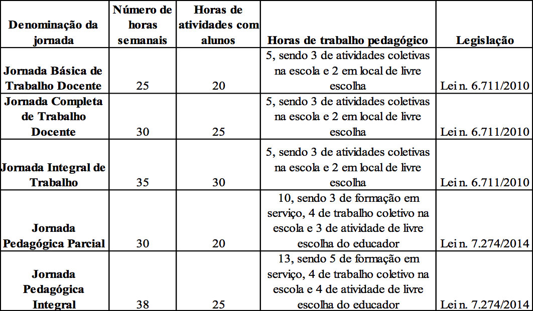 A jornada de trabalho é fator fundamental na análise das condições de trabalho do professor, das condições de qualidade de oferta educacional e também da formação continuada. O trabalho docente é constituído pelo tempo que o professor trabalha diretamente com os alunos e por aquele que é dedicado a um conjunto de atividades que dão suporte àquelas realizadas na sala de aula.