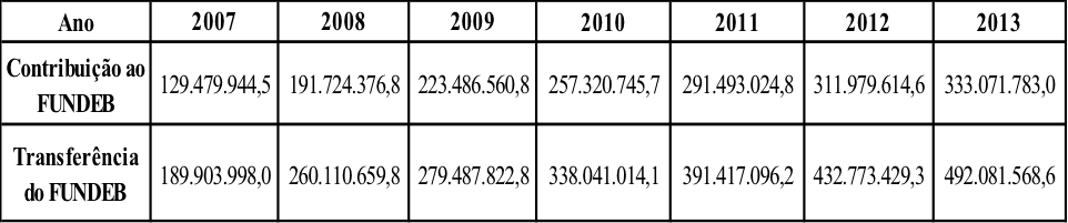 Esses dados demonstram que o município de Belo Horizonte configura-se como receptor dos recursos vinculados do FUNDEB. De fato, na medida em que, os recursos transferidos do município para a composição do fundo, são, em valores nominais, inferiores aos valores recebidos do fundo. Observa-se pelos dados da tabela, que do ano de 2007 ao ano de 2013 os recursos transferidos para o município obtiveram um aumento de 159,1%.