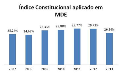 O gráfico 01 evidencia que, no município de Belo Horizonte, não ocorre o execução das determinações da Lei Orgânica de Belo Horizonte sobre a porcentagem a ser aplicada em MDE. É possível observar que, no ano de 2008, não foi alcançado o índice constitucional obrigatório. Observa-se que em 2013, o índice apresentou substantiva diminuição no percentual aplicado em MDE.