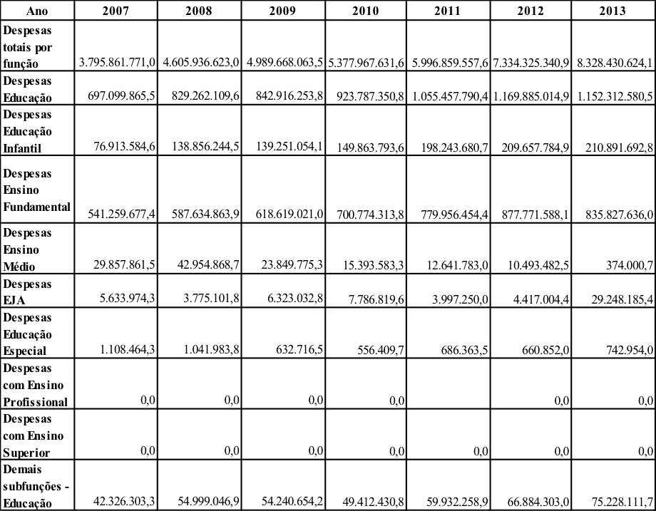 Os dados referentes à despesa evidenciam uma ampliação de 65,30% no total, no período de 2007 a 2013. Na Educação Infantil a evolução dos gastos foi de 174,19%, no Ensino Fundamental apresentou um crescimento de 54,42%. A educação de jovens e adultos foi a etapa que apresentou crescimento exponencial de 419,14%, porém o quantitativo ainda é muito pequeno. A educação especial apresentou uma diminuição de 32,97% nos gastos. Nas despesas relacionadas ao Ensino Médio observa-se uma queda de 98,75%. Nas despesas denominadas “Demais subfunções da Educação”, houve um crescimento de 77,73% dos recursos no período estudado.