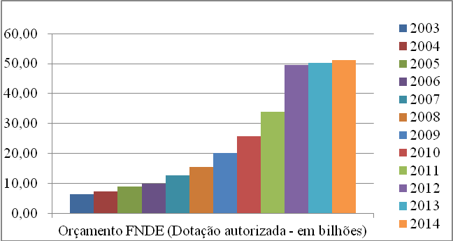 Como pode-se verificar no gráfico 1, nos últimos anos é possível perceber um aumento considerável no orçamento gerenciado pelo FNDE, passando de cerca de 5 (cinco) bilhões em 2003, para 55,8 (cinquenta e cinco) bilhões em 2014.