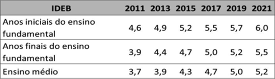 Meta 7: fomentar a qualidade da educação básica em todas as etapas e modalidades, com melhoria do fluxo escolar e da aprendizagem, de modo a atingir as seguintes médias nacionais para o IDEB:
