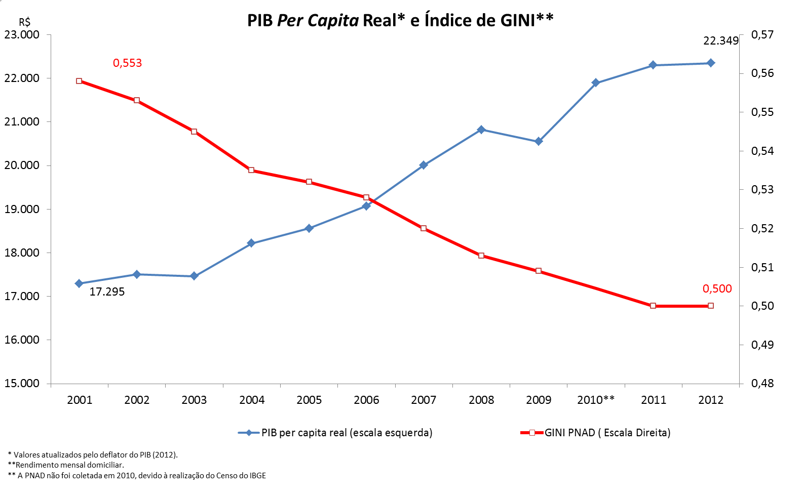 Analisando a situação distributiva brasileira fica explícita uma queda no índice de Geni mostrando o início de uma melhora gradual da distribuição de renda motivada principalmente por políticas sociais compensatórias e focalizadas, com destaca Fagnani (2011, p. 1): “nessa visão, a estratégia para se alcançar o “desenvolvimento social” se encerra numa única ação: focalização nas pessoas que estão abaixo da “linha de pobreza”. Qualquer política social que não atenda esse requisito “beneficia os ricos” e deve ser objeto de reformas ortodoxas visando seu aniquilamento”.