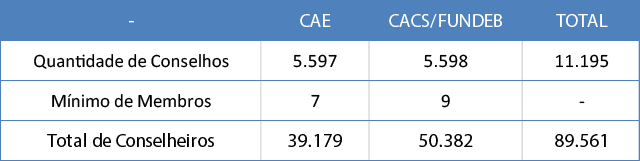 Considerando que o CACS e o CAE devem ser instituídos em todos os entes federados, esse modelo chama às atividades de acompanhamento dos recursos uma vasta quantidade de pessoas, investidas em cargo de conselheiro. O quadro abaixo explicita o número de conselheiros envolvidos, considerando-se a composição mínima em cada formação: