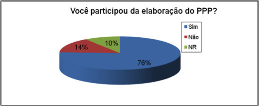 Dentre as perguntas realizadas no questionário, uma delas se referiu à participação da gestora escolar na elaboração do PPP. De forma majoritária, as respostas atingiram o percentual de 75% das participantes, que alegou ter ajudado na elaboração. Esse dado, apesar de expressivo, foi considerado pequeno, pois se esperava a totalidade, tendo em vista que o PPP representa a vertente da concepção escolar, na qual todas as ações deveriam ser sustentadas por ele.