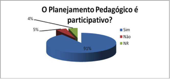 A participação de todos os envolvidos na comunidade escolar se traduz numa ação democratizante e essencial no processo de ensino e aprendizagem. Acreditando que o espaço escolar é um local de construção de saberes, e que todos os envolvidos estão num processo de aprendizagem. Assim, na formação contínua de forma ampla, outras instâncias foram apresentadas pelas gestoras escolares como possibilitadoras da construção da aprendizagem. Dentre elas, a elaboração do planejamento pedagógico foi um dos aspectos ressaltados. Nessa lógica, perguntamos se o planejamento pedagógico foi participativo.