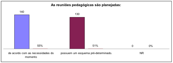 Os resultados apresentaram uma aproximação muito grande entre as duas opções, que a princípio pareciam contraditórias. Na comparação entre as duas respostas presentes, no gráfico construído, a partir dos dados coletados foram possíveis identificar certa simetria entre as ações que aconteciam na escola, no intuito de conjugar as demandas existentes. Nesse sentido, as reuniões expressavam as demandas eminentes para a realização do trabalho, contudo, as reuniões estavam inseridas nos espaços destinados à formação dos profissionais da educação.