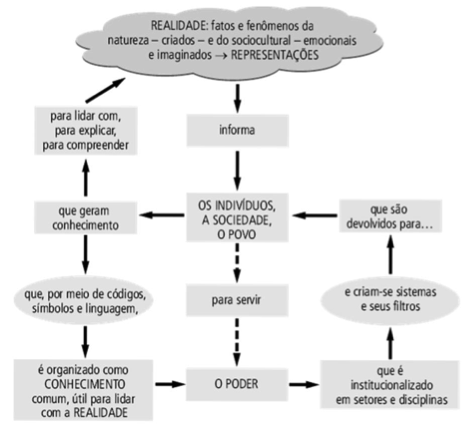 D'Ambrosio elabora, então, uma proposta epistemológica para o entendimento integral do Ciclo do Conhecimento, ao qual é inerente o Ciclo Vital, que não só destaca os conhecimentos gerados pelos grupos de indivíduos para a sua sobrevivência e transcendência, escolhidos por responderem a interesses comuns do grupo, mas também as estruturas de poder nele presentes. D'Ambrosio (2009, p. 141) afirma que “a escolha é orientada pela ética. Em contraposição, a imposição de uma forma de ação sobre as demais é o ponto de partida para as estruturas de poder”, que expropriam o conhecimento comum e, conforme explica em D'Ambrosio (2011a), “através de mecanismos institucionais impregnados de controle, de mistificação e de filtros, é devolvido ao povo, que em primeira instância é o responsável pela origem desse conhecimento […] para a sobrevivência dos indivíduos e sua servidão ao poder” (p. 54), fazendo com que o conhecimento gerado fique inacessível a quem o gerou e que o sistema escolar e outros “funcionem de acordo com regras de códigos que, em si, constituem novos corpos de conhecimento.” (55). Nesse sentido, concordamos com o autor que o papel da Educação não é servir ao poder e que “o trabalho do educador não é servir a esse sistema de filtros, mas sim estimular cada indivíduo a atingir sua potencialidade criativa e também estimular e facilitar a ação comum (55).