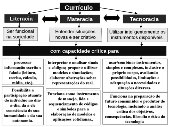 Na concepção etnomatemática, D'Ambrosio (2012, p. 63) conceitua “educação como uma estratégia da sociedade para facilitar que cada indivíduo atinja o seu potencial e para estimular cada indivíduo a colaborar com outros em ações comuns na busca do bem comum” e define currículo como “a estratégia chave para a ação educativa”. O Programa Etnomatemática questiona o currículo com base no 'ler, escrever e contar', que ainda é praticado, pois, segundo D'Ambrosio (2005, p. 99), “é, em sua concepção e detalhamento, obsoleto, desinteressante e pouco útil”. Propõe, então, uma organização das estratégias de ensino, como já mencionamos, a partir do trivium Literacia-Materacia-Tecnoracia, com base no entendimento de D'Ambrosio (2011a, p. 50) de que conhecer é saber-fazer e que “as práticas ad hoc para lidar com situações problemáticas surgidas da realidade são o resultado da ação de conhecer.”. Com base nas obras de D'Ambrosio (2005, 2011a, 2013), elaboramos uma síntese da proposta curricular etnomatemática, ilustrada na figura 2, na qual destacamos os instrumentos de currículo, suas principais características, finalidades e funções: