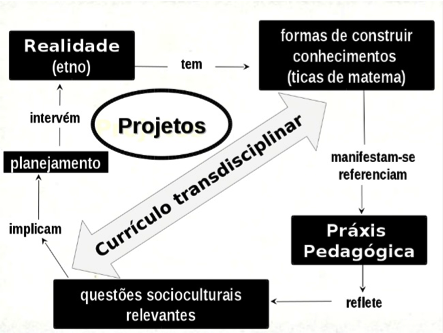 Para compreendermos a figura 2, devemos estar cientes de que, para o Programa Etnomatemática, a Educação deve ter metas maiores, nas quais se destacam o desenvolvimento de potencial e o favorecimento da ação comum, em vias do bem comum e do pleno exercício da cidadania e de que é por não conceber um currículo fragmentado em disciplinas, com base na hegemonia dos saberes acadêmicos sobre os demais, que defende como alternativa funcional a Transdisciplinaridade. Além disso, o seu entendimento de que o conhecimento é vital e decorrente de informações colhidas de uma realidade, que é inevitavelmente modificada a partir de ações de quem as colhe, impõe foco na relação indissociável do indivíduo com sua realidade, tendo em vista as tica de matema nos distintos etnos.
