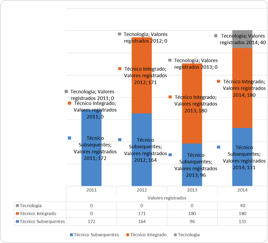 Buscando analisar a realidade do Campus Parnamirim, lócus da reflexão desse trabalho investigativo têm no quadro e figura abaixo os indicadores quantitativos da oferta dos cursos técnicos integrados ao Ensino Médio de Informática e Mecatrônica, no período de 2011 a 2014.