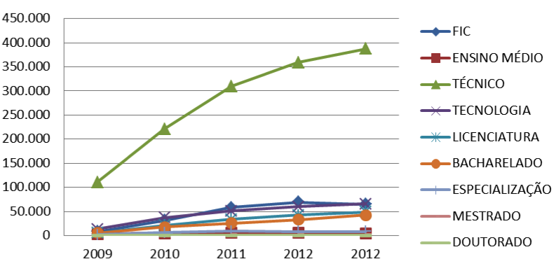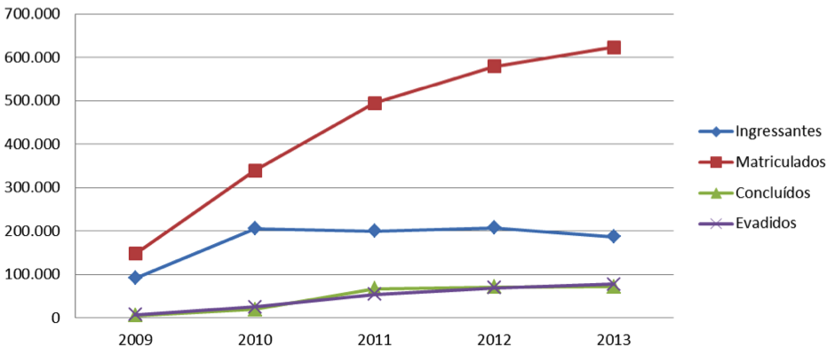 Tal fato acarreta índices de retenção e de evasão que requerem a atenção das instituições, em âmbito local e também nacionalA Secretaria de Educação Profissional e Tecnológica do Ministério da Educação – SETEC/MEC tem feito um monitoramento dos índices de rendimento da Rede Federal, bem como das ações estratégicas para redução da evasão e aumento da permanência e êxito, por meio do Ofício Circular nº 77/2015-DDR/SETEC/MEC e da Nota Informativa 138/2015-DPE e DDR/SETEC/MEC, em cumprimento ao Acórdão TCU nº 503/2013., uma vez que com a ampliação do acesso o aumento das situações de evadidos também aumenta, como pode ser visto na figura abaixo.