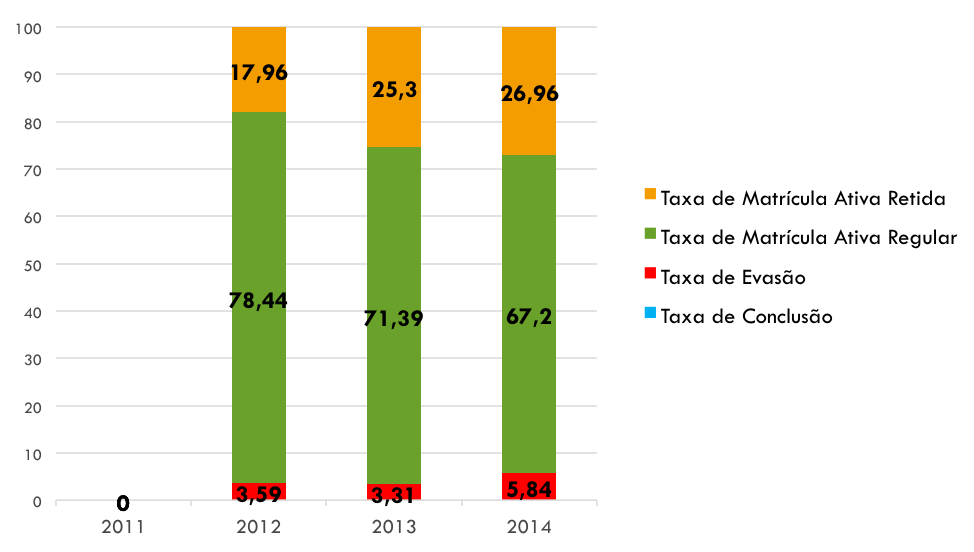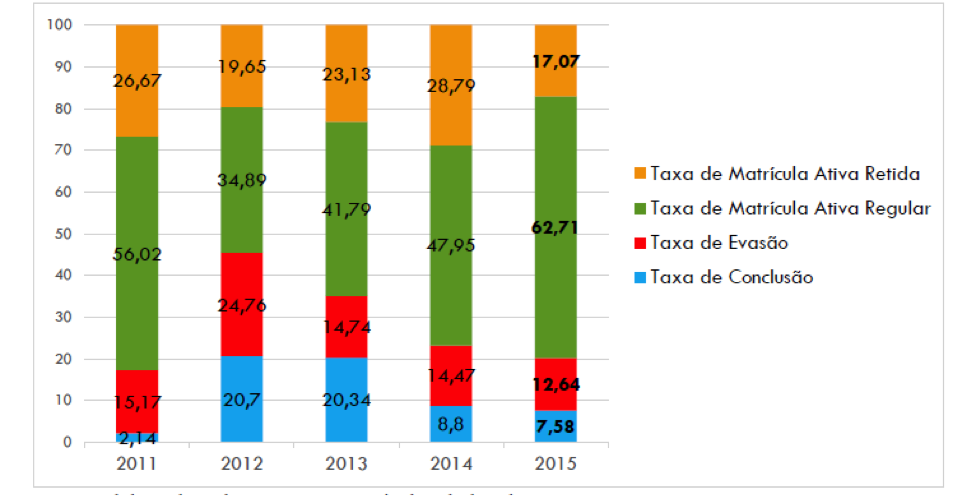 Assim, observa-se que apesar da taxa de conclusão apresentar valores muito baixos, as taxas de matrículas ativas regulares e retidas somadas ultrapassam os 70%, fato que permite inferir que em anos futuros haverá um aumento do índice da taxa de conclusão.