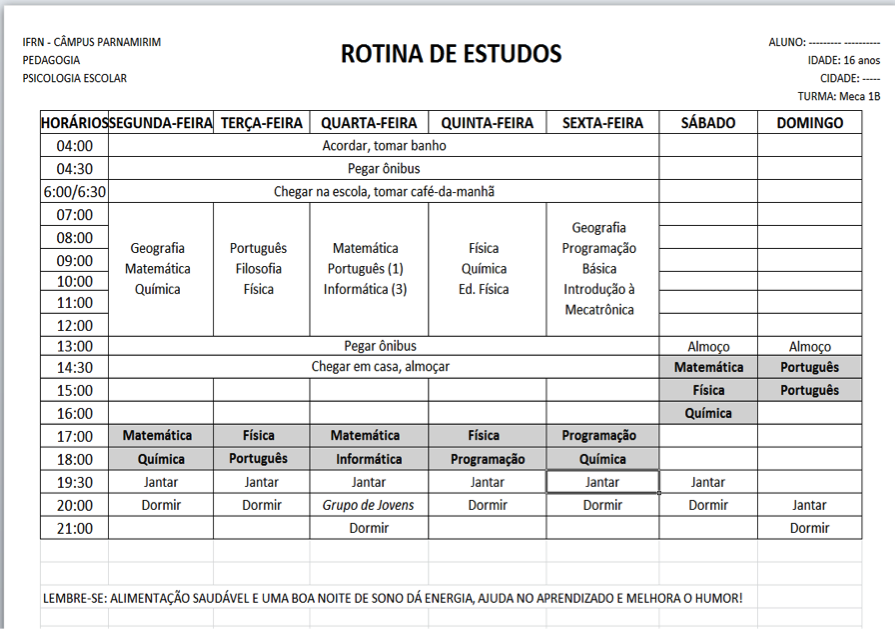 No início de cada ano letivo é disponibilizado aos alunos um formulário no qual são solicitadas informações sobre sua rotina desde quando acorda até quando vai dormir, todos os dias da semana, bem como as condições do seu ambiente de estudo.