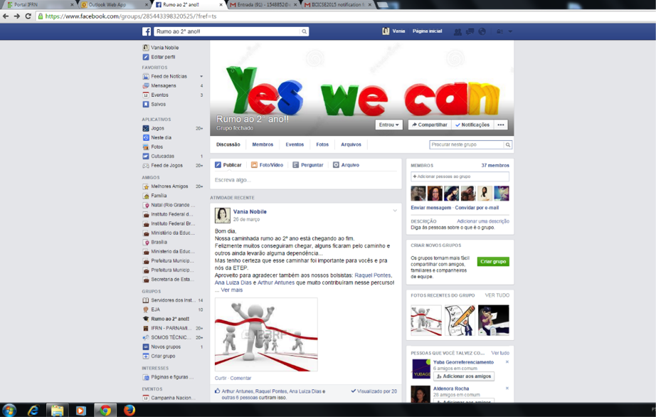 Uma outra estratégia desenvolvida no Projeto foi a criação na rede social Facebook um grupo fechado, formado pelos alunos da Turmas Mecatrônica 1C e Informática 1C, bolsistas e Equipe Técnico-pedagógica do Campus Parnamirim como estratégia de incentivo aos estudantes e comunicação de reuniões, aulas e outros temas relacionados às aulas.