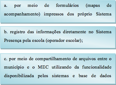 Para que se efetive o acompanhamento da frequência escolar de crianças e adolescentes cuja s famílias sejam beneficiárias do PBF, o MEC desenvolveu e consolidou o Sistema Presença.