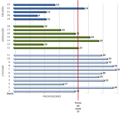 O Gráfico 6 mostra que, do conjunto dos itens, 13 deles atenderem aos padrões considerados, atingindo ou excedendo o ponto de corte, 22. A categoria utilidade foi a que obteve o mais alto desempenho: nove entre 11 itens atenderam aos padrões a que estavam relacionados. A categoria adequação, com o segundo maior desempenho, três dos sete itens atenderam aos padrões a que se referiam. O mais baixo desempenho foi o da categoria precisão: apenas um item, em um grupo de cinco, atingiu o ponto de corte.
